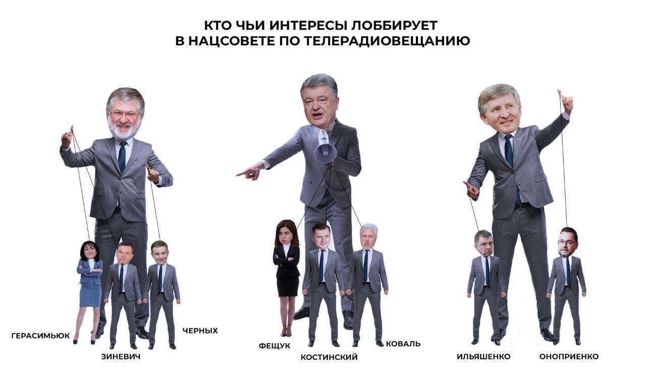 Коломойскому принадлежит телеканал 1+1, Порошенко - "Прямой" и 5-й канал (прямые конкуренты в информационной нише NewsOne и 112), Ахметову - телеканал "Украина" (также, по слухам, он собирается запускать и свой новостной канал).