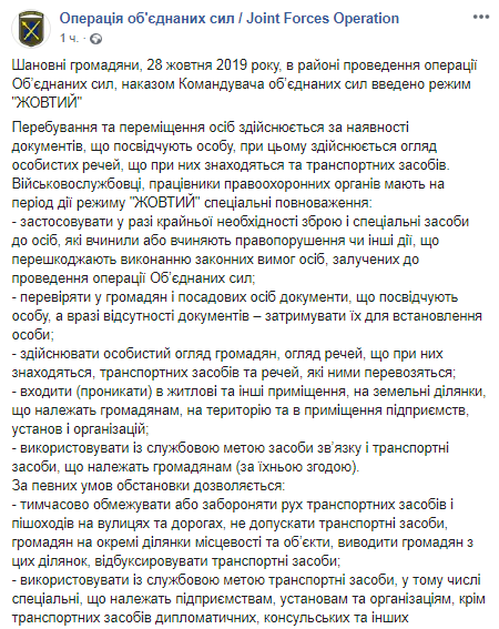 В понедельник, 28 октября, в зоне проведения операции Объединенных сил на Донбассе был введен режим "желтый", предусматривающий расширение полномочий военнослужащих и правоохранителей и наложение дополнительных ограничений для гражданских лиц. Об этом пресс-центр штаба ООС сообщает в Facebook.