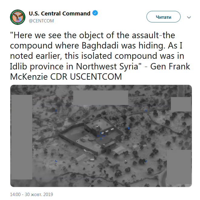 Центральное командование ВС США показало первое фото и обнародовало видео с места операции, в ходе которой был ликвидирован лидер ИГИЛ Абу Бакр аль-Багдади. Командующий силами США в регионе генерал Фрэнк Маккензи разместил фотографию в официальном Twitter.