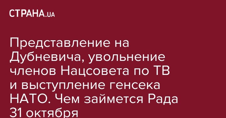 Верховная Рада на пленарном заседании в четверг, 31 октября, рассмотрит представления на снятие неприкосновенности, задержание и арест депутата Ярослава Дубневича (группа "За будущее"), вопросы об увольнении членов Нацсовета по ТВ и создании ВСК по взрывам военных арсеналов.