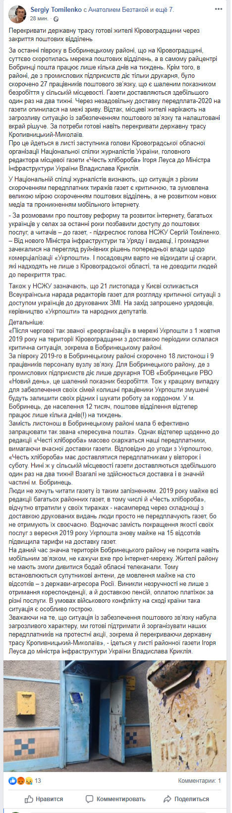 По его словам, за последние полгода в Бобринецком районе Кировоградской области существенно сократилась сеть почтовых отделений, а в самом райцентре Бобринце почта работает всего несколько дней в неделю. Кроме того, в районе, где из промышленных предприятий действует только типография, было сокращено 27 работников почтовой связи. Газеты доставляются в основном один раз в две недели. Из-за неудовлетворительной доставки подписка-2020 на газеты оказалась на грани срыва. Местные жители жалуются на угрожающую ситуацию с обеспечением почтовой связью и при необходимости готовы даже перекрывать государственную трассу Кропивницкий - Николаев.