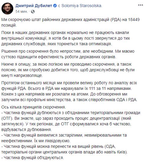 Как сообщил Дубилет, такие кадровые решения помогут повысить эффективность работы государственных органов. "Решение о сокращении было непростым, но необходимым. Мы существенно повысим эффективность работы государственных органов", - написал Дубилет.