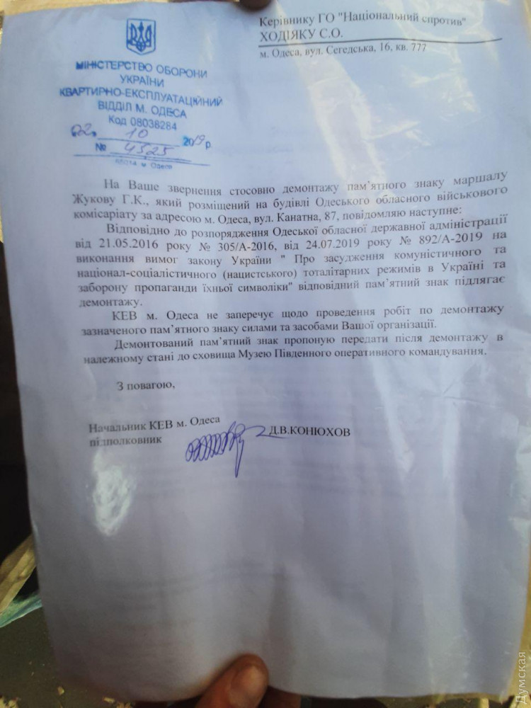 31 октября со здания военкомата в Одессе (ул. Канатная, 87) убрали барельеф советскому маршалу Жукову. Его демонтировали члены общественной организации "Національний спротив", которые позиционируют себя, как борцы за демократические ценности и борцы против коррупции.