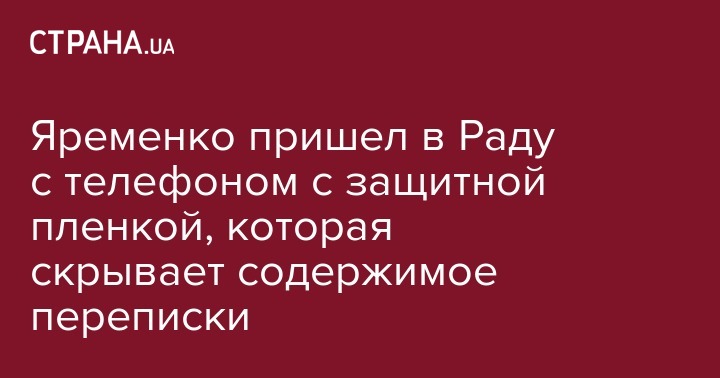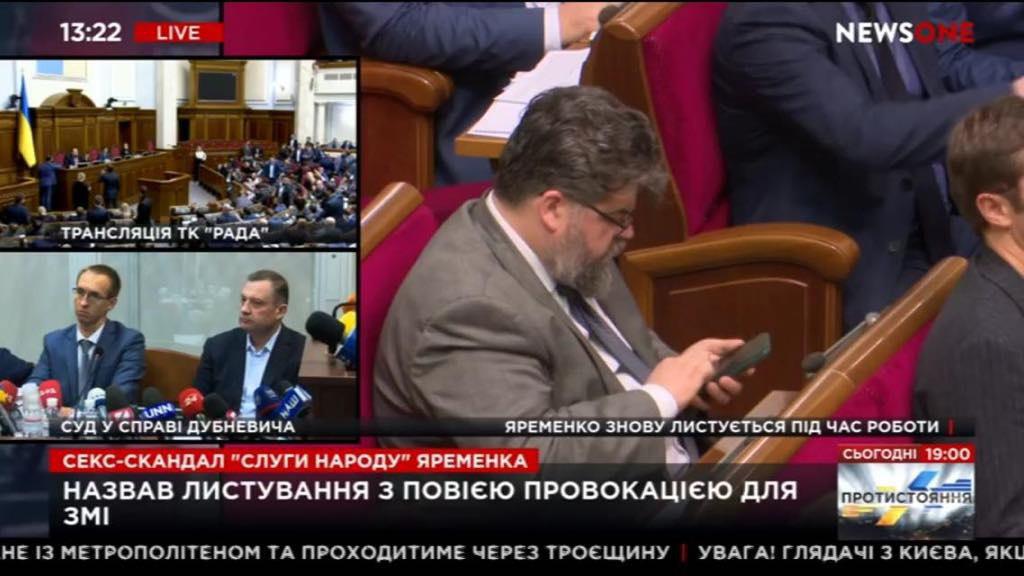 Народный депутат от "Слуги народа" Богдан Яременко, который попал в секс-скандал, пришел на заседание Верховной Рады с телефоном, на котором находится защитная пленка, скрывающая содержание переписки. Об этом свидетельствуют кадры из прямого эфира канала NewsOnе.