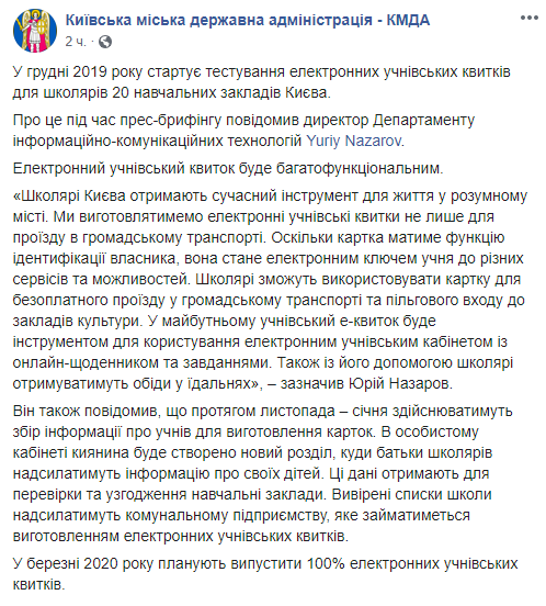 В Киеве с декабря 2019 года начнут тестирование многофункциональных электронных ученических билетов для 20 учебных заведений. Об этом во время пресс-брифинга сообщил директор департамента информационно-коммуникационных технологий КГГА Юрий Назаров.