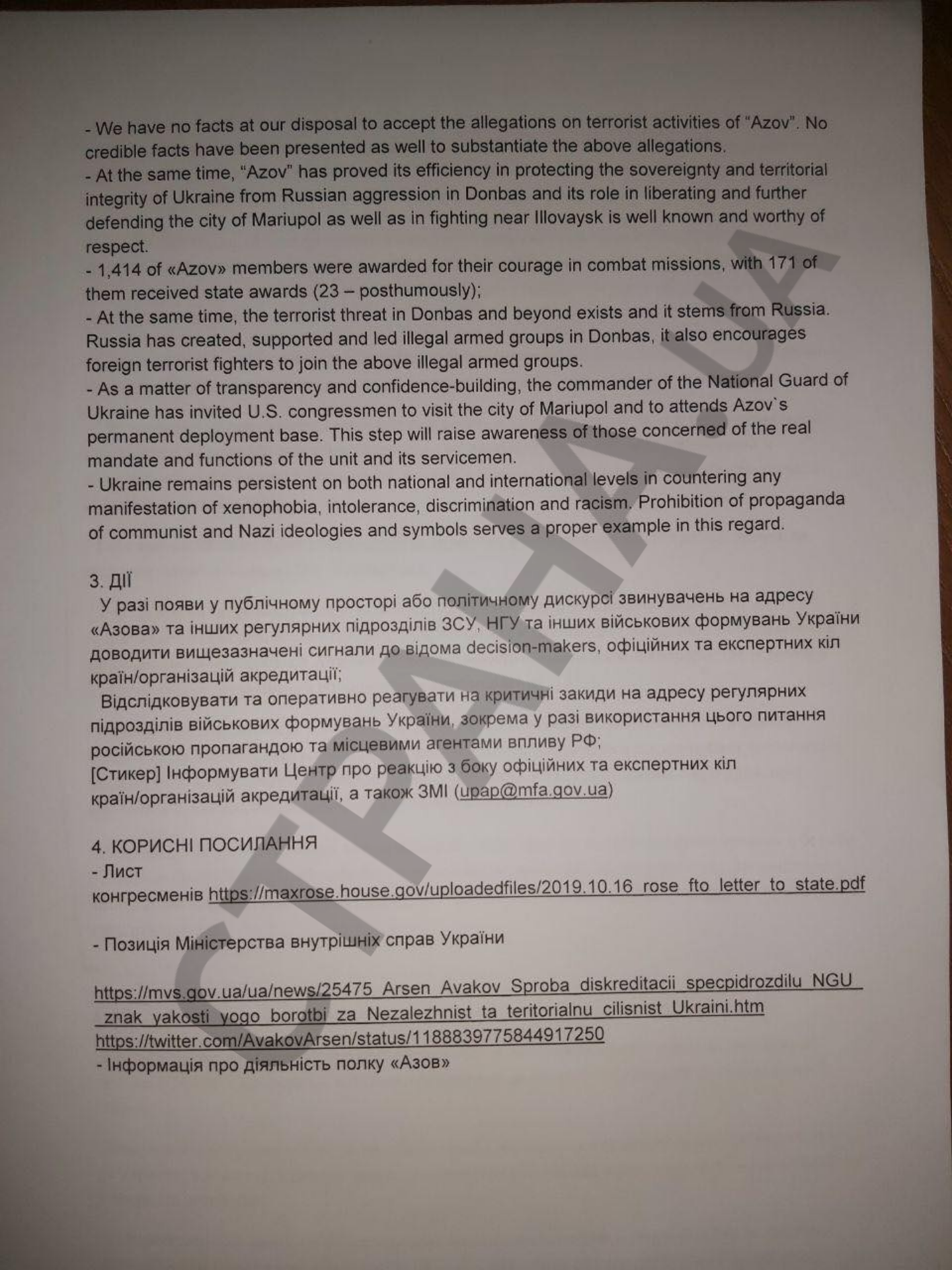 Также дипломаты должны доносить до всех мысли о том, что "Азов" противостоит российской агресси на Донбассе, сколько его солдат получили награды. Еще их просят отслеживать реакцию на письмо конгрессменов "российских агентов влияния".