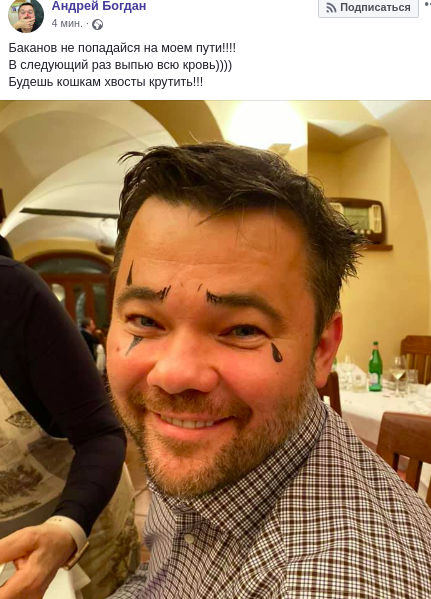 "Баканов не попадайся на моем пути!!!! В следующий раз выпью всю кровь)))) Будешь кошкам хвосты крутить!!!", - написал глава Офиса президента.