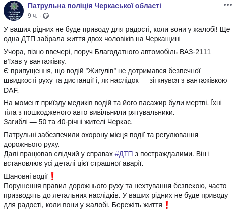 Погибшие - 50 и 40-летние жители Черкасс. Патрульные обеспечили охрану места происшествия и регулирование дорожного движения. Далее работал следователь по делам ДТП с пострадавшими. Он и устанавливает все детали этой страшной аварии.
