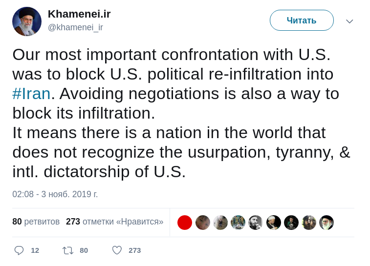 "Наше самое серьезное противостояние заключалось в том, чтобы блокировать политическое возвращение США в Иран. Избегать переговоров - это один из путей блокировки их проникновения. Это означает, что в мире существует народ, не признающий узурпации, тирании и международного диктата США", - заявил иранский лидер.