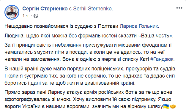 Стерненко написал, что недавно познакомился с судьей из Полтавы Ларисой Гольник. С пафосом он отметил, что об этой женщине "можно без формальностей сказать "Ваша честь".