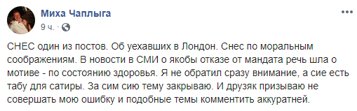 "Снес один из постов. Об уехавших в Лондон. Снес по моральным соображениям. В новости в СМИ о якобы отказе от мандата речь шла о мотиве - по состоянию здоровья. Я не обратил сразу внимание, а сие есть табу для сатиры. За сим сию тему закрываю", - объяснил Чаплыга в новом посте.
