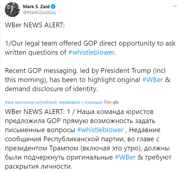 "Быть осведомителем - это не партийная работа, и импичмент не является целью. Это не наша роль. Поэтому мы предложили такую форму", - написал адвокат в Twitter.