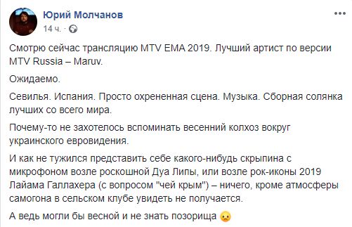 Журналист Юрий Молчанов: "Смотрю сейчас трансляцию MTV EMA 2019. Лучший артист по версии MTV Russia – Maruv. Ожидаемо. Севилья. Испания. Просто охрененная сцена. Музыка. Сборная солянка лучших со всего мира.