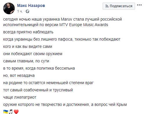 Радиоведущий Макс Назаров: "Сегодня ночью наша украинка Maruv стала лучшей российской исполнительницей по версии MTV Europe Music Awards. Всегда приятно наблюдать, когда украинцы без лишнего пафоса, тихонько так побеждают.