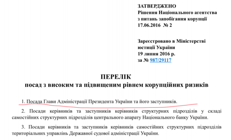 До недавнего времени должность главы Офиса президента странным образом была не обязательной для подачи электронной декларации. Дело в том, что эти позиции не относятся к перечню госслужащих, то есть не подпадают под действиие закона "О предотвращении коррупции".