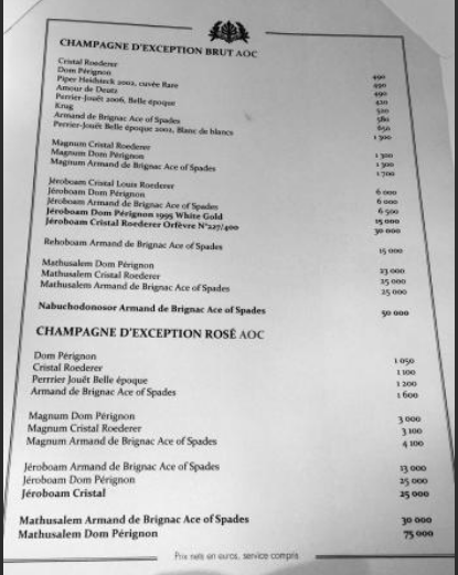 Цены шампанского в этом ресторане стартуют от 490 евро за бутылку. Максимальная стоимость бутылки розе Dom Perignon – 75 тысяч евро.