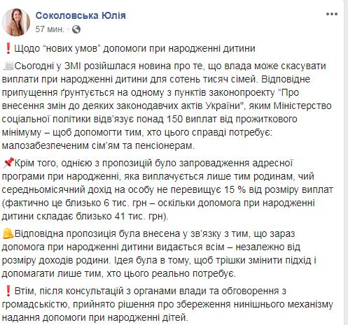 После этого заявления министр социальной политики Украины Юлия Соколовская заявила, что выплаты при рождении ребенка для семей со среднемесячным доходом на человека выше 6 тыс грн отменена не будет, как это планировалось ранее.