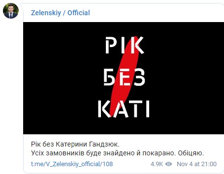 Соответствующий пост опубликован в официальной канале Зеленского в соцсетях. "Год без Екатерины Гандзюк. Всех заказчиков будут найдены и наказаны. Обещаю", - написал президент.