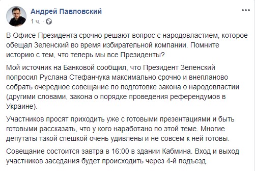"Мой источник на Банковой сообщил, что Президент Зеленский попросил Руслана Стефанчука максимально срочно и внепланово собрать очередное совещание по подготовке закона о народовластии (другими словами, закона о порядке проведения референдумов в Украине)", - написал Павловский.