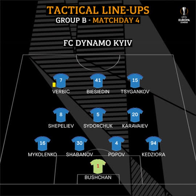 Динамо: Бущан - защитники - Кендзера, Попов, Шабанов, Миколенко - полузащитники - Караваев, Сидорчук, Шепелев - атака Цыганков, Беседин, Вербич.