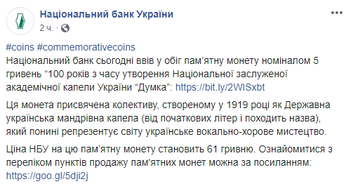 Тираж выпуска монеты "100 лет со времен создания "Думки" - 40 тысяч штук.