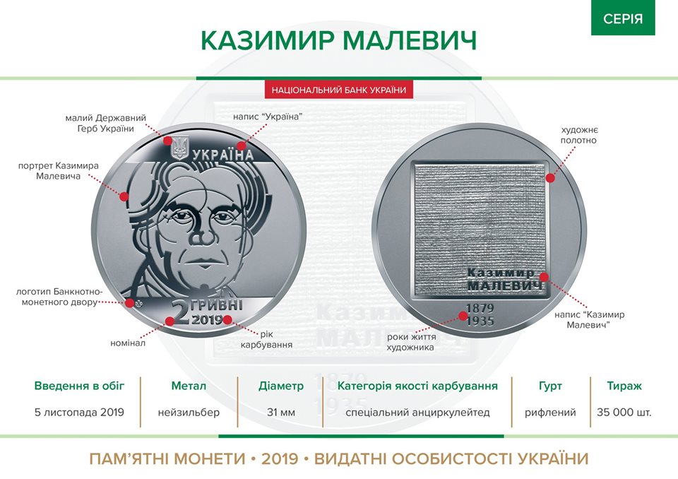 На аверсе монеты вверху на зеркальном фоне расположен малый государственный герб и надпись "Украина" справа от него, на матовом фоне по центру - портрет Казимира Малевича, внизу - надпись "2 гривни 2019". На реверсе изображено художественное полотно, подготовленное к работе, на фоне которого размещена надпись "Казимир Малевич", внизу - годы жизни художника: "1979-1935".