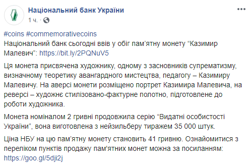 Тираж выпуска памятных монет "Казимир Малевич" - 35 тысяч штук, а розничная цена - 41 грн.