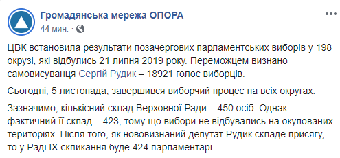 "ЦИК установила результаты внеочередных парламентских выборов в 198 округе, которые состоялись 21 июля 2019. Победителем признан самовыдвиженец Сергей Рудык - 18921 голос избирателей", - говорится в сообщении.