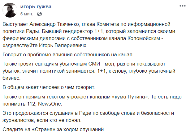 "Выступает Александр Ткаченко, глава Комитета по информационной политики Рады. Бывший гендиректор 1+1, который запомнился своими феерическими диалогами с собственником канала Коломойским - "здравствуйте Игорь Валериевич".