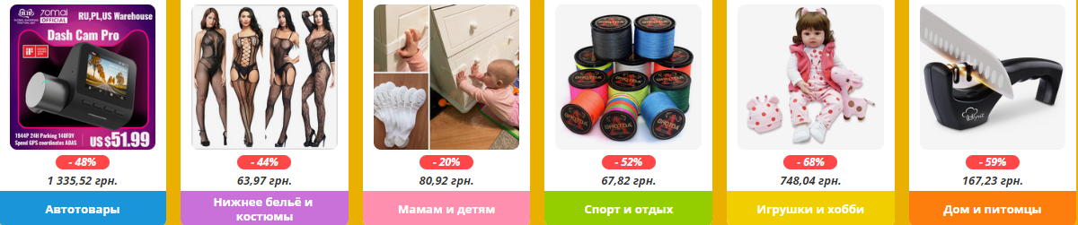 На автотовары предоставляется скидка 48%, на нижнем белье и костюмах можно сэкономить 44%, мамам и детям - 20% скидки, на товары рубрики "спорт и отдых" - 52% скидка, игрушки и хобби - 68%, дом и питомцы - 59%.