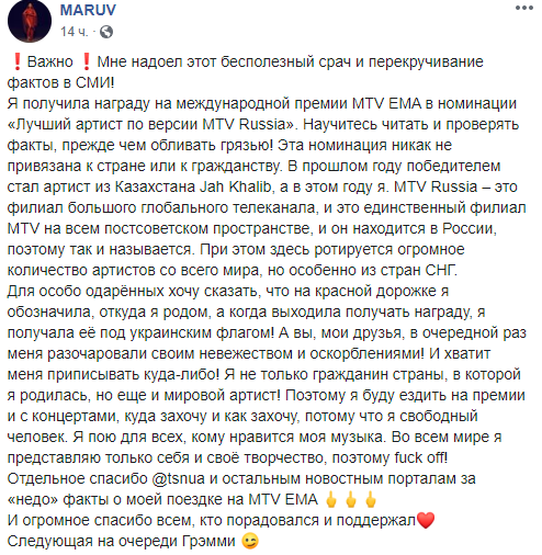 Марув посоветовала журналистам перепроверять факты перед тем, как "обливать грязью". И напомнила, что награда не связана с гражданством. Она привела в пример исполнителя из Казахстана Jah Khalib, который победил год назад. Также она написала несколько слов в защиту российского музыкального телеканала MTV Russia, назвав его единственным филиалом MTV на всем постсоветском пространстве.