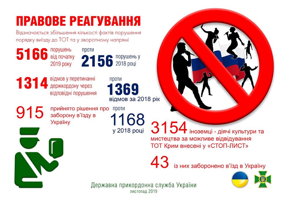 В украинском ведомстве отметили, что всего с начала года выявлено более 5 тысяч фактов нарушения лицами порядка въезда/выезда с/на временно оккупированные территории. За это нарушение (по ст.204-2 КУоАП) составлен 4251 админпротокол. Кроме того, за это правонарушение 1314 иностранцам отказано в пересечении государственной границы, а в отношении почти 915 - принято решение о запрете въезда в Украину. Также с начала года запрещен въезд в Украину 43 иностранцам из числа деятелей культуры и искусства.