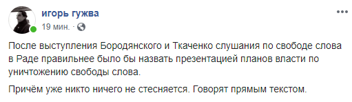 "После выступления Бородянского и Ткаченко слушания по свободе слова в Раде правильнее было бы назвать презентацией планов власти по уничтожению свободы слова.