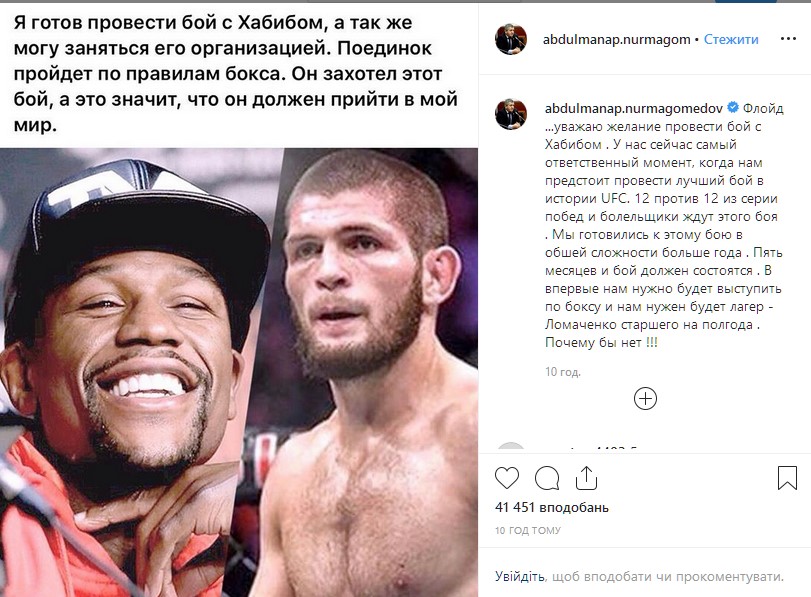 "Флойд ...уважаю желание провести бой с Хабибом . У нас сейчас самый ответственный момент, когда нам предстоит провести лучший бой в истории UFC. 12 против 12 из серии побед и болельщики ждут этого боя. Мы готовились к этому бою в обшей сложности больше года. Пять месяцев и бой должен состоятся. В впервые нам нужно будет выступить по боксу и нам нужен будет лагерь Ломаченко-старшего на полгода . Почему бы нет", - отметил он.