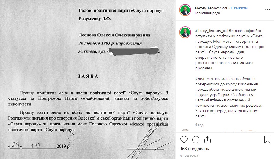 Беспартийный народный депутат Алексей Леонов, избранный на парламентских выборах от "Слуги народа" по мажоритарному округу №135 в Приморском районе Одессы, решил вступить в партию. Об этом он сообщил у себя в Instagram.