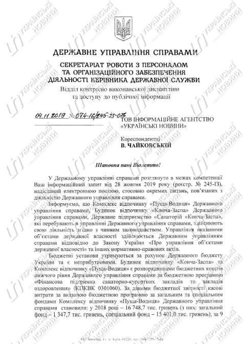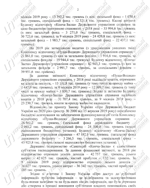 За первые 9 месяцев года из этих средств было потрачено 13,4 млн гривен, а получено 12,3 млн гривен доходов. Проект госбюджета на 2020 год предусматривает 26,6 млн гривен расходов на "Пущу-Водицу".