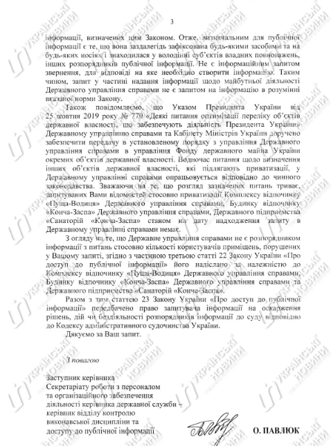"Рассмотрение указанных вопросов продолжается, поэтому запрашиваемых вами сведений относительно приватизации… в Государственном управлении делами нет", - сказано в ответе.