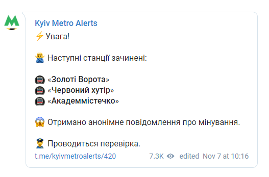 В Киеве, 7 ноября, временно закрыли станции метро "Золотые ворота", "Красный хутор" и "Академгородок". Причиной этого стало сообщение о минировании, сообщается в Telegram-канале ведомства.