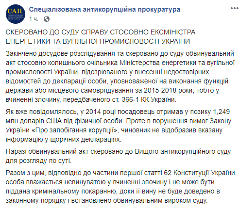 "Сейчас обвинительный акт направлен в Высший антикоррупционный суд для рассмотрения по существу", - говорится в сообщении.