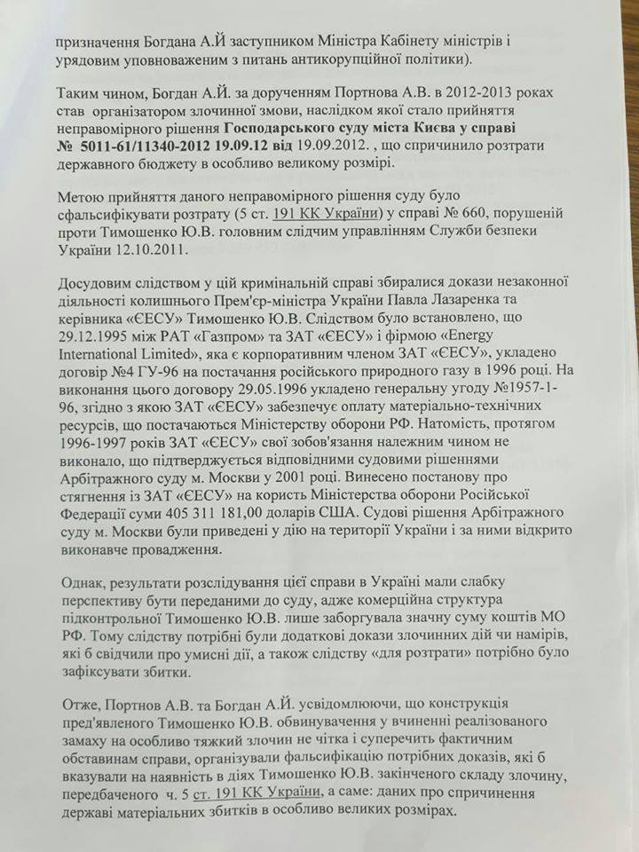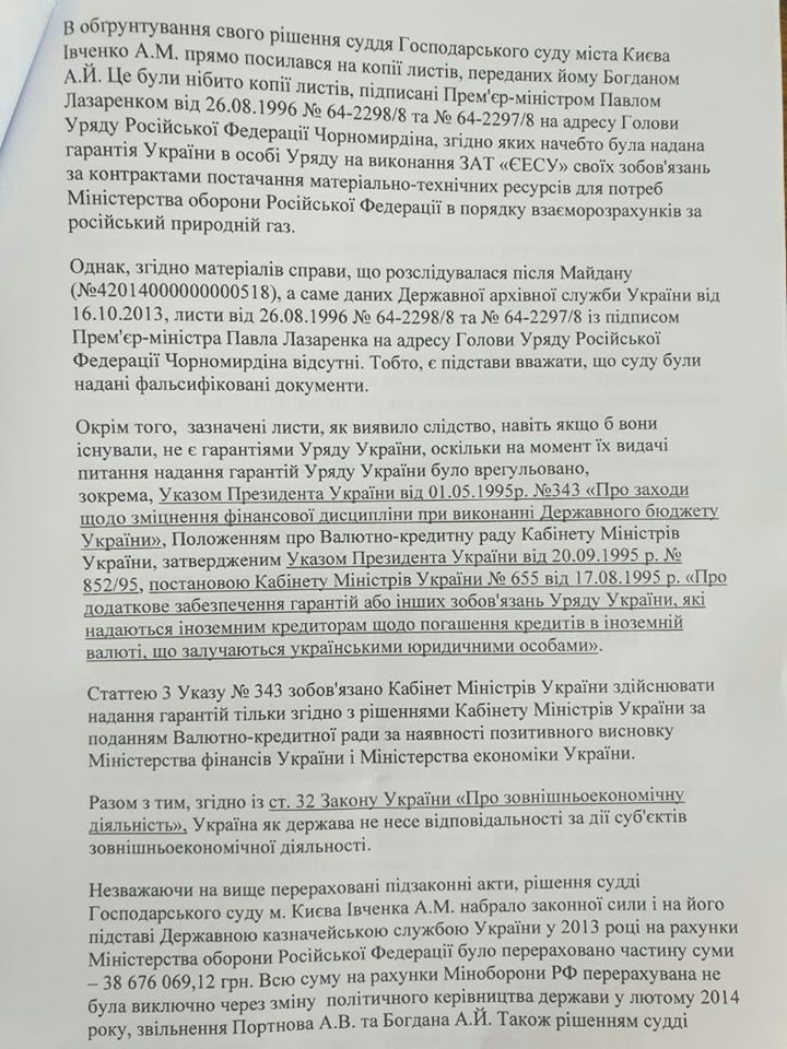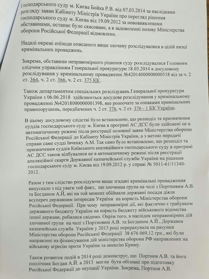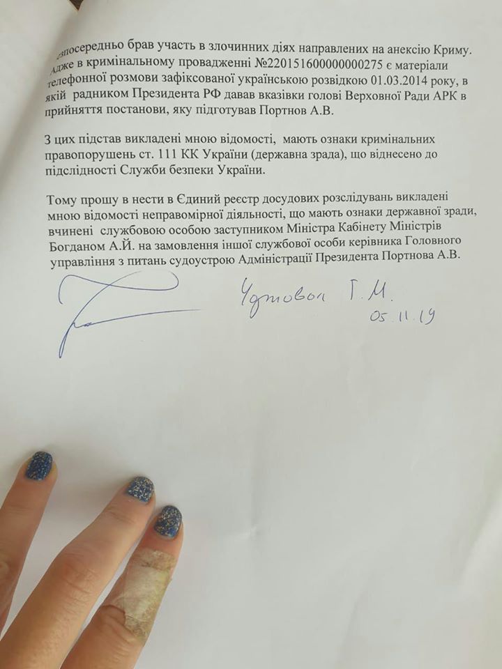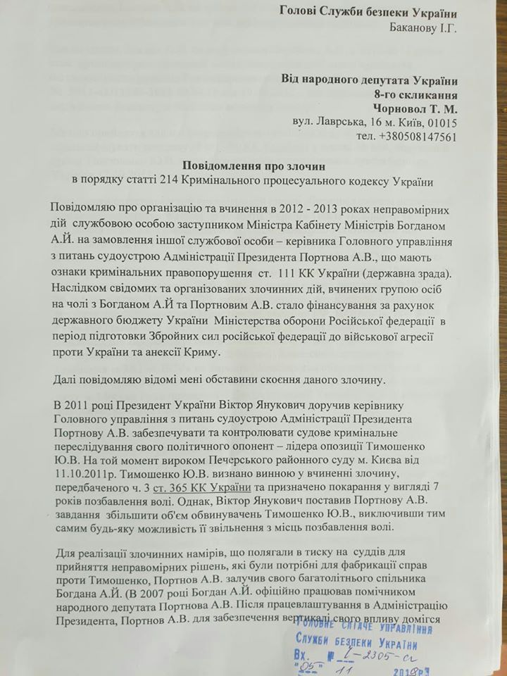 "Измена Украины заключается в том, что Андрей Богдан, будучи должностным лицом КМУ в период 2010-2014 годов, организовал растрату средств государственного бюджета в размере 3 млрд грн в интересах Министерства обороны РФ. Причем следствием преступления Богдана стало финансирование из бюджета Украины вооруженных сил врага в период его подготовки к нападению на Украину, оккупации и аннексии Крыма (ведь 36 млн грн на счета МО РФ были перечислены в 2013 году). Это как раз подследственность СБУ ", - сообщила Чорновол и прикрепила скрины заявления на 7 страницах.
