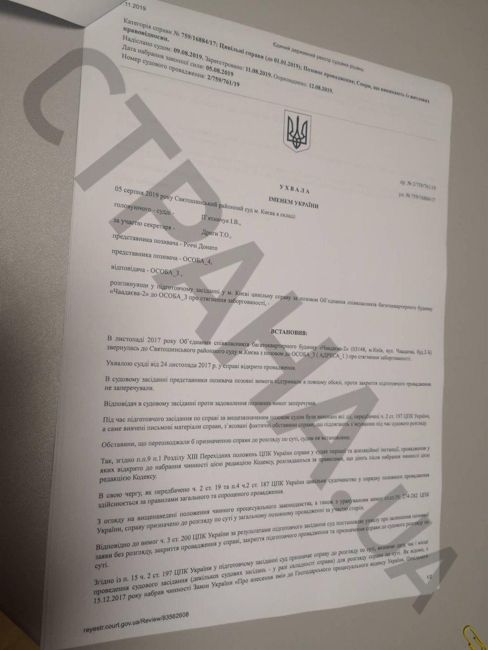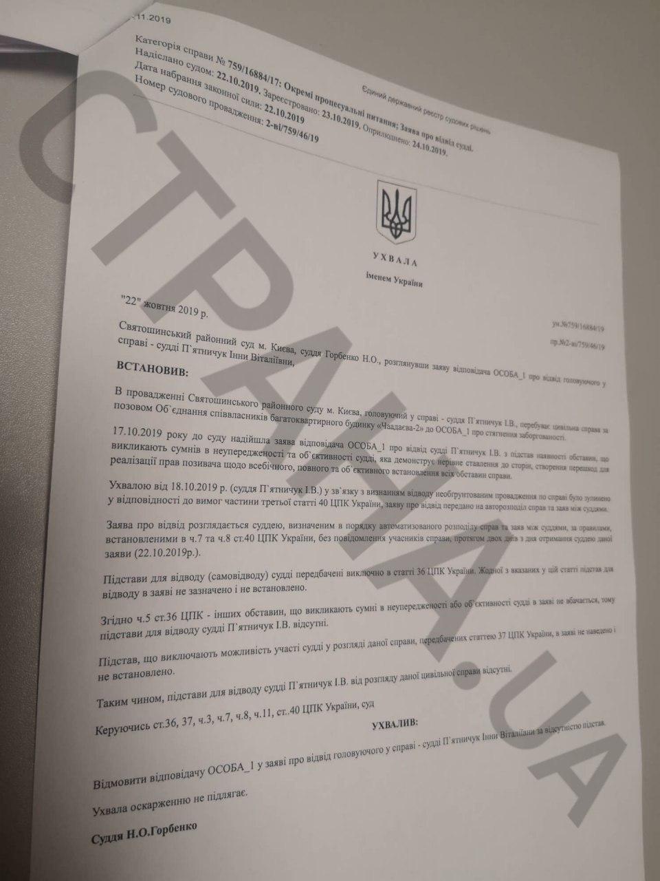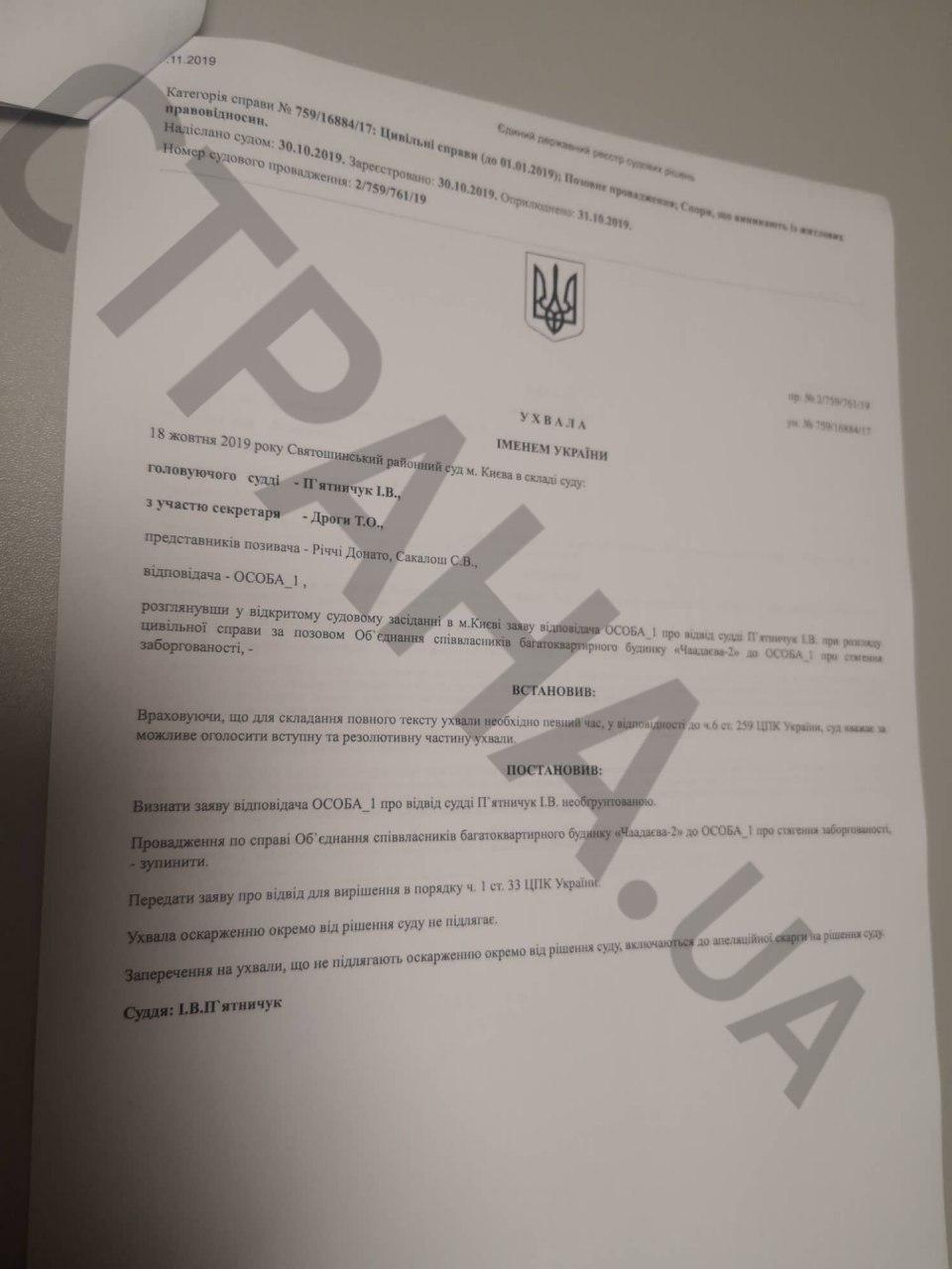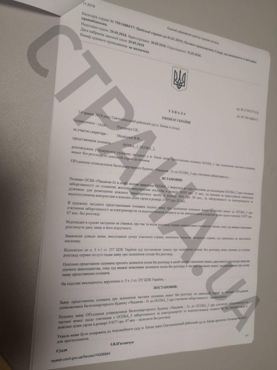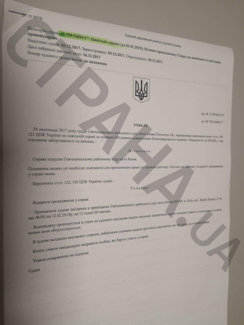 Согласно документам, суды о взыскании задолженности по взносам с Берестецкого тянутся еще с ноября 2017 года, когда объединение совладельцев многоквартирного дома на улице Чаадаева, 2а обратились в Святошинский районный суд Киева с иском. 24 ноября 2017 года суд открыл производство. Однако с тех пор суд постоянно переносили, а сторона Берестецкого заявлял отвод судье. Так, 17 октября 2019 года ответчик обратился в суд с заявлением об отводе судьи Пятничук И.В., мотивируя это тем, что с 2013 года семья судьи знакомы с семьей Берестецкого.