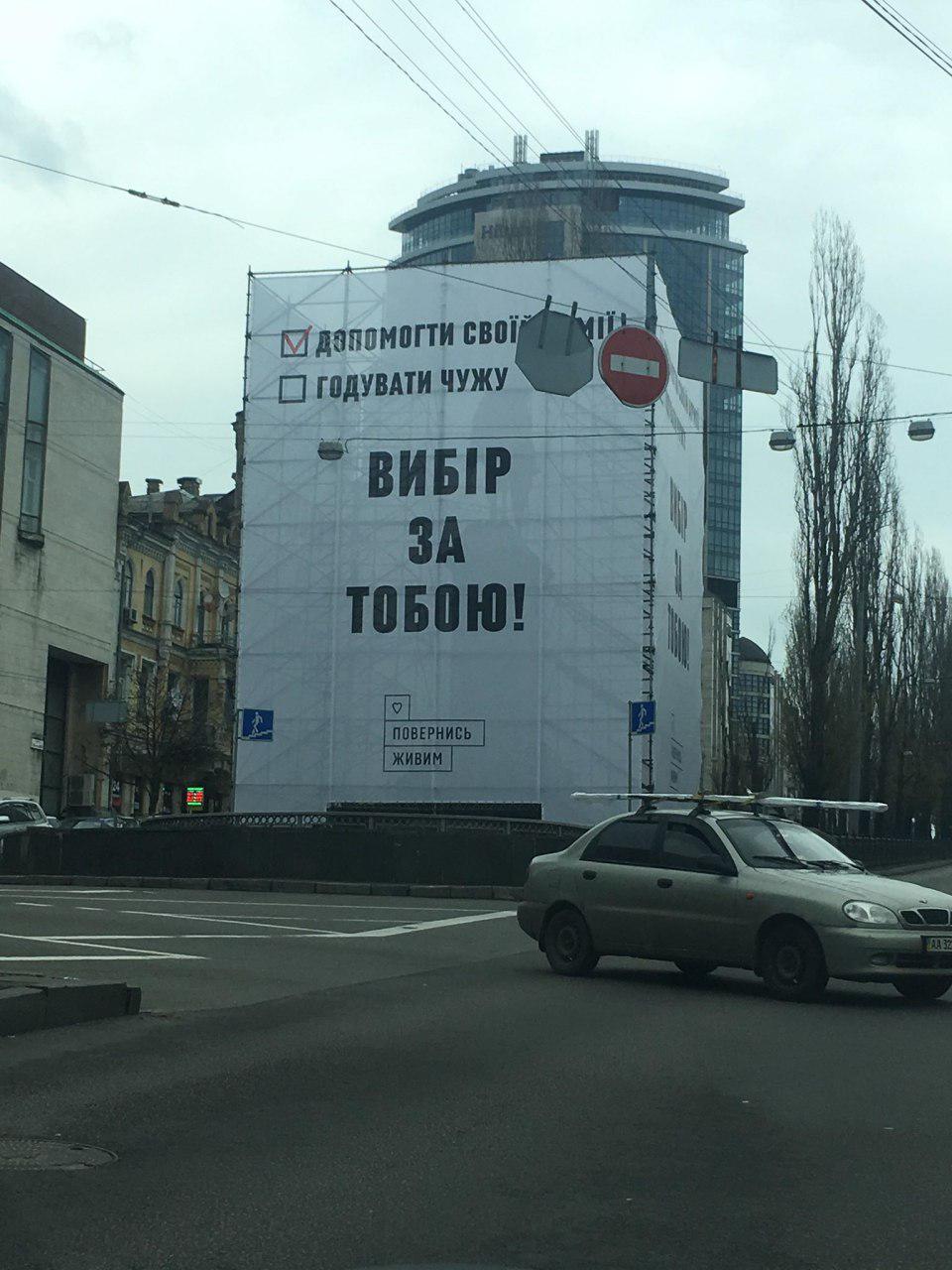 Так, на плакатах были изображены пункты для голосования: "помогать своей армии" или "кормить чужую", при этом галочка стоит напротив первого пункта. Центральное место на плакате занимает слоган: "Выбор за тобой", внизу расположена подпись: "Повернись живим" и логотип. Они указывают на то, что установил баннеры одноименный благотворительный фонд, который существует в Украине с 2014 года.