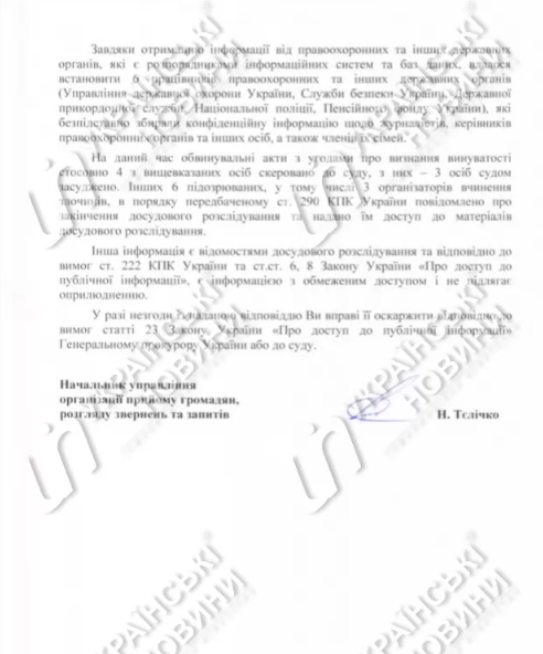 Как сообщили в ГПУ, расследование дела завершено, сейчас подозреваемые знакомятся с материалами уголовного производства.