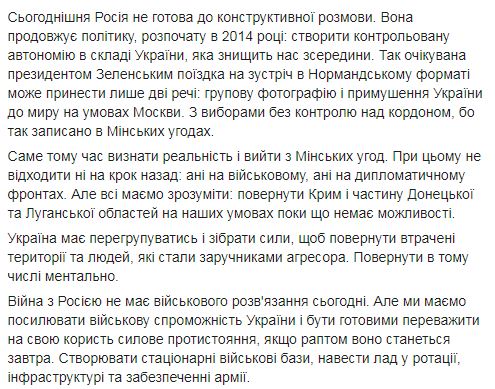 "Украина должна выйти из Минских соглашений и сосредоточиться на государственных интересах: остановиться, навести порядок, собрать силы и спланировать мир на своих условиях. И реализовать этот план с сильной позиции - тогда, когда для этого появятся реальные возможности", - говорится в заявлении.