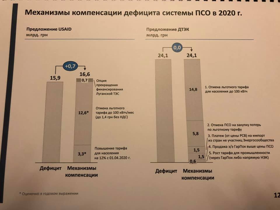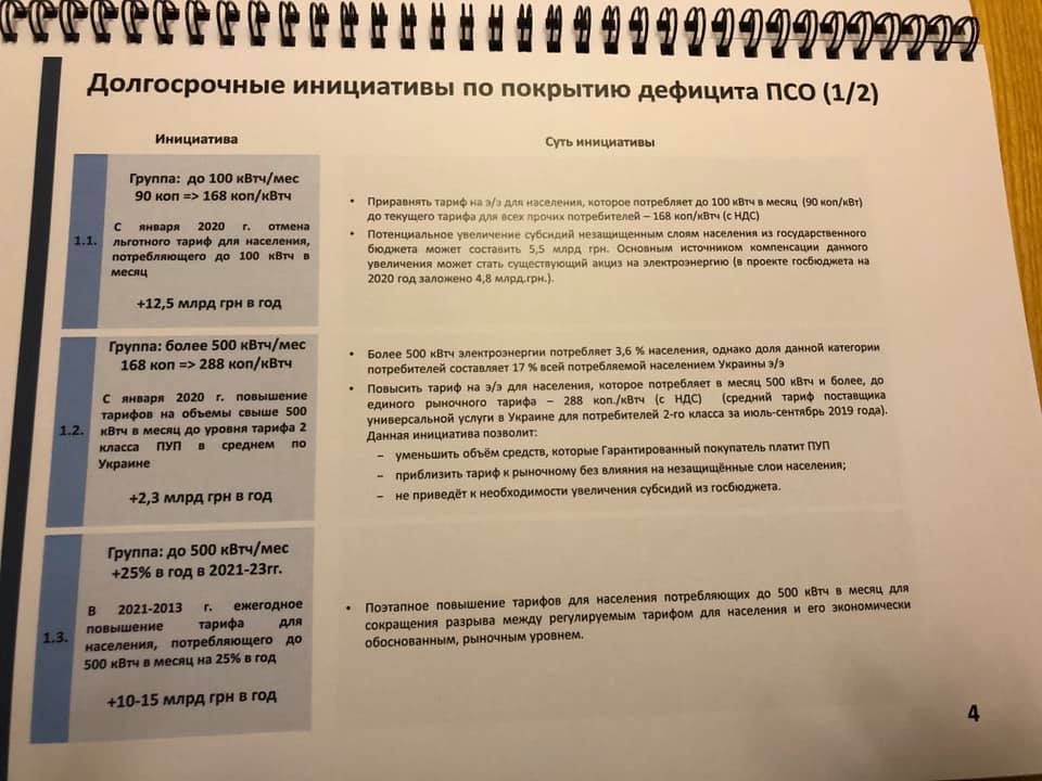 По его словам, ДТЭК предлагает с 1 января 2020 года увеличить тариф на первые 100 кВт-ч/месяц на 86,7% до 1,68 гривны/кВт-ч. Это позволит получать дополнительно 12,5 млрд гривен в год. Также предлагается при потреблении более 500 кВт-ч/месяц поднять тариф на 71,4% или на 1,2 грн  - до 2,88 гривны/кВт-ч. Это даст дополнительных 2,3 млрд гривен в год.