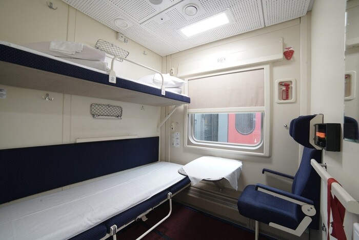 На фото СВ, купейные, штабные и плацкартные вагоны. В частности, спальные вагоны повышенной комфортности оборудованы душем и биотуалетами. В купе расположены два нижних дивана шириной 60 сантиметров каждый, с индивидуальным освещением.