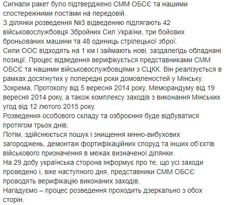 12:20 – практическое разведение сил и средств начато. Сигналы ракет были подтверждены СММ ОБСЕ и нашими наблюдательными постами на передовой", – говорится в сообщении пресс-центра ООС.