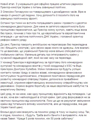 "В команде Премьера я буду отвечать за подготовку его международных встреч и международных визитов в тесной координации с МИД и вице-премьером Дмитрием Кулебой. Моими главными kpi будут успешные контакты главы Правительства со своими визави, международными финансовыми институтами и дипломатами, создание позитивных предпосылок для развития международного сотрудничества Украины, помощь в привлечении инвестиций, содействие более эффективному экономическому сотрудничеству между государствами", - отметила она.