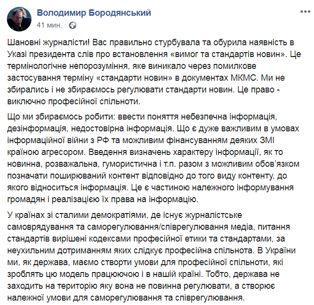 В посте Бородянский обратился к журналистам и отметил, что их не зря обеспокоило и возмутило наличие в указе слов об установлении "требований и стандартов новостей".
