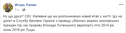 "Ну что, друзья? СБУ. Наверное мы начинаем новый этап в жизни. Иду на допрос в Службу безопасности Украины по поводу убиенных мирных московских граждан во время прорыва блокады Луганского аэропорта", - написал в соцсети бывший командир роты в батальоне "Айдар".